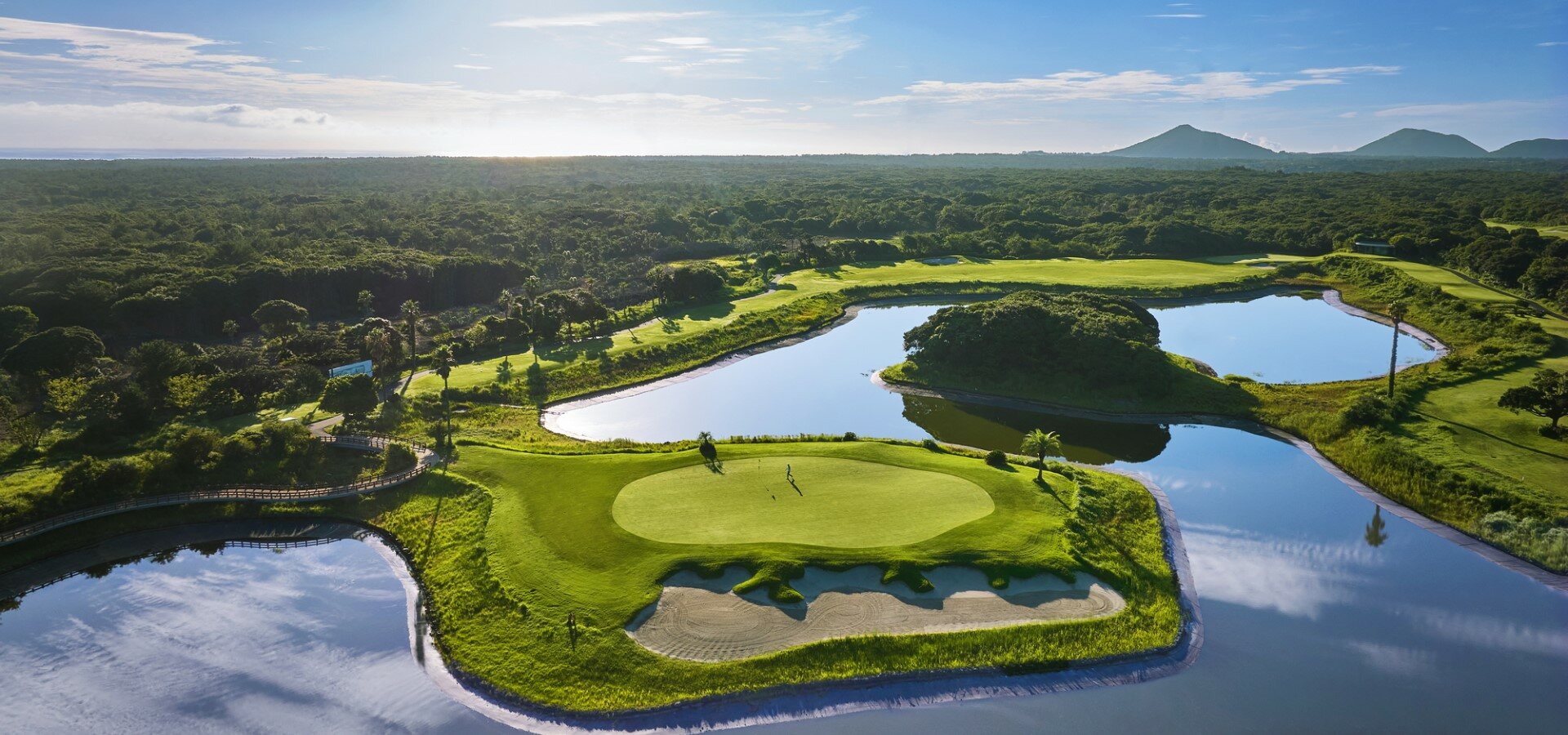 사이프러스 골프 & 리조트는 한라산 중산간 해발 350m 고지에 위치하여 사계절 내내 쾌적하고 이국적인 라운딩 경험을 제공하는 36홀 규모의 프리미엄 골프장입니다. 코스는 크게 웨스트/노스 회원제 코스와 이스트/사우스 대중제 코스로 구성되어 있으며, 총 전장은 14,500야드가 넘는 광활한 규모를 자랑합니다. 모든 홀에서 한라산의 웅장한 전경과 제주의 아름다운 자연을 파노라마처럼 조망할 수 있으며, 특히 제주 특유의 삼나무 숲과 오름 지형을 살린 자연 친화적인 코스 설계가 돋보입니다. 도전적이면서도 전략적인 레이아웃은 골퍼들에게 매 홀 새로운 즐거움을 선사하며, 리조트 시설과 연계되어 품격 있는 휴양 골프를 즐기기에 최적의 장소입니다.
