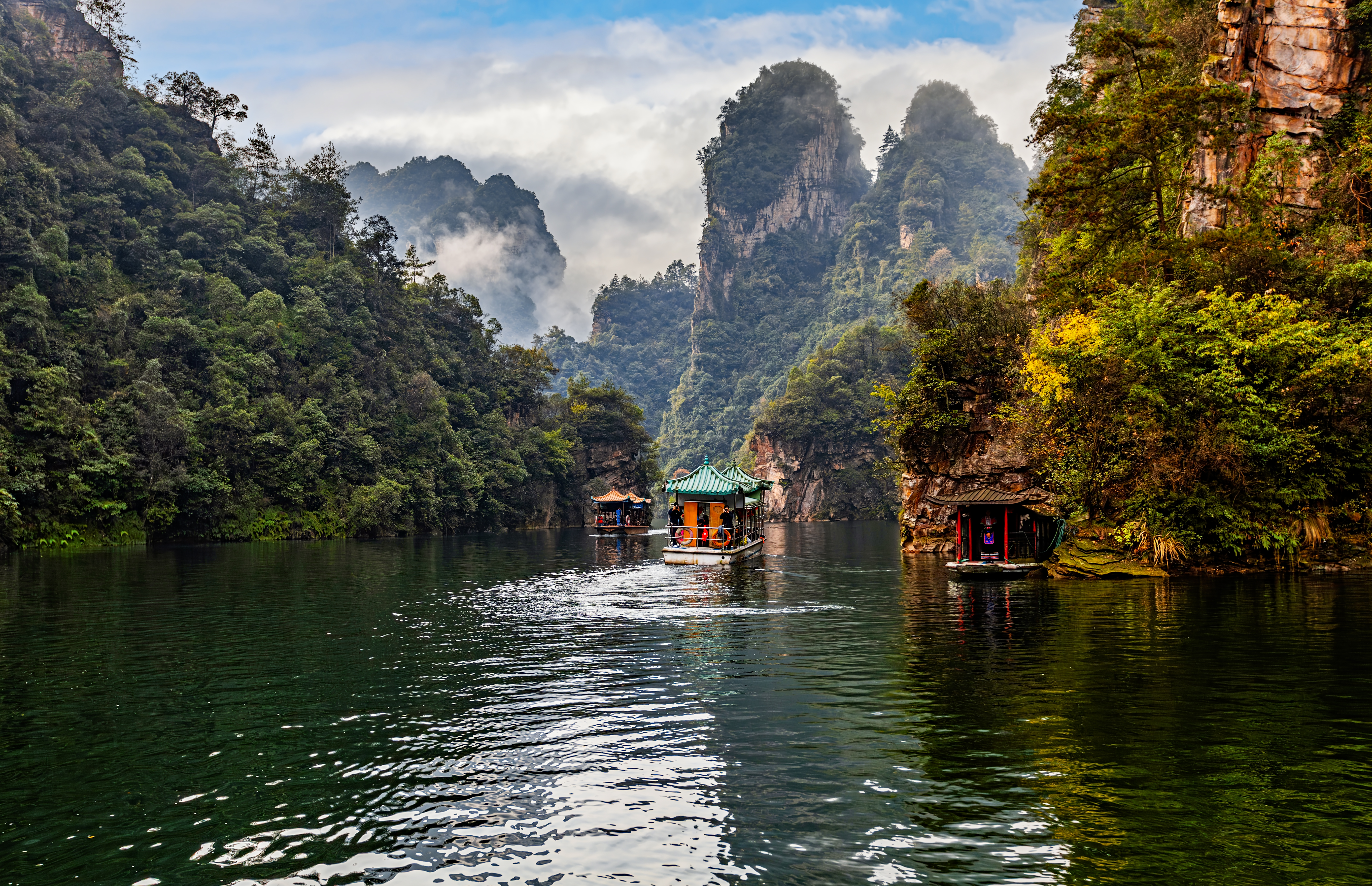 숲과 기암 봉우리로 둘러싸인 호수로, 물이 맑고 잔잔해 주변 풍경이 호수에 반사되는 모습이 매우 아름답습니다. 호수를 배로 유람하며 주변 절경을 즐길 수 있습니다.